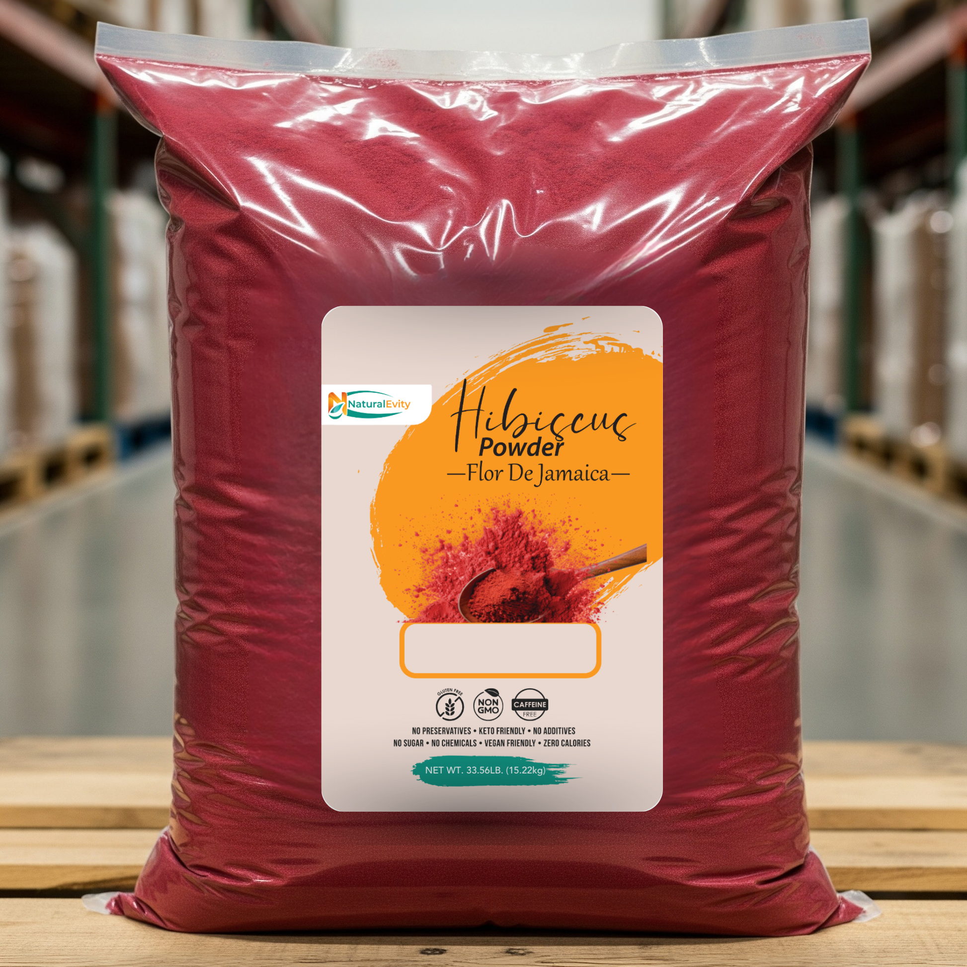 Our Hibiscus Powder – 35 lb bulk package is a finely milled hibiscus powder crafted for high-volume commercial use. This format is ideal for manufacturers and brands that require uniform texture and easy integration into formulations.