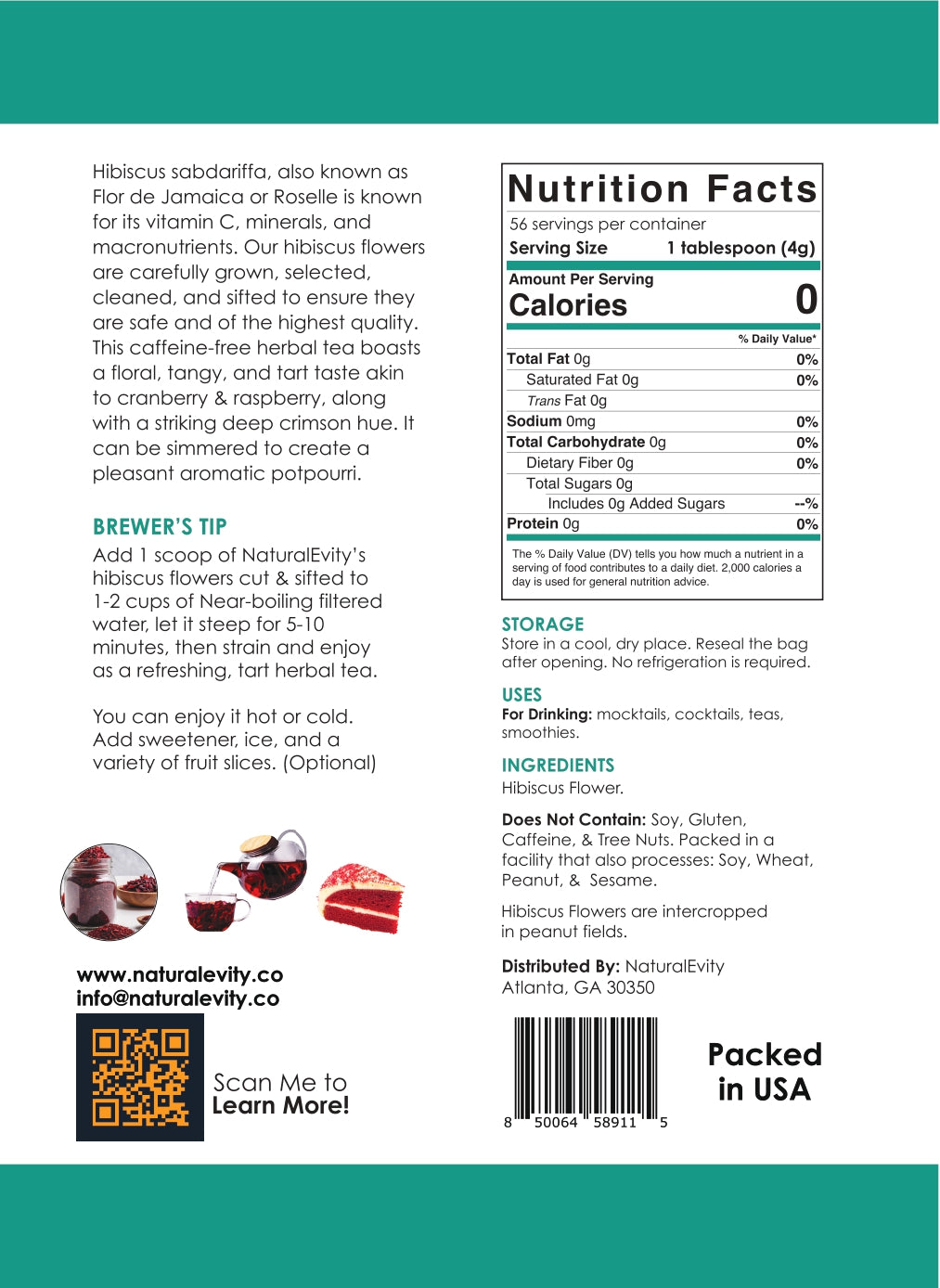 Add 2-3 scoops of NaturalEvity’s Hibiscus Whole Flowers to 1-2 cups of near-boiling filtered water, let it steep for 5-10 minutes, then strain and enjoy as a refreshing, tart herbal tea. You can enjoy it hot or cold. Add sweetener, ice, and a variety of fruit slices. (Optional)